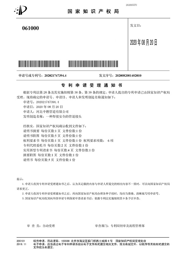 “一種焊接安全的管道接頭”專利申請受理通知書