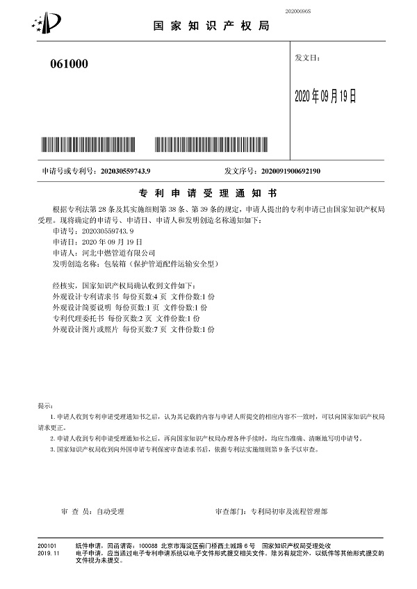 “包裝箱(保護管道配件運輸安全型)”專利申請受理通知書