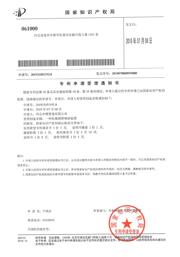 “一種無縫鋼管在線冷卻裝置”專利申請受理通知書