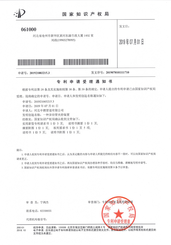 “一種彎管加工裝置”專利申請受理通知書
