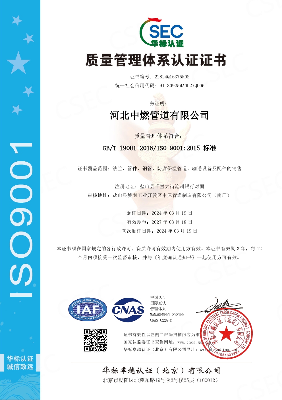中原管道-ISO 9001-2015-質量管理體係認證 -